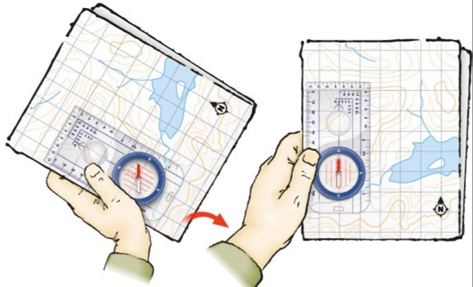 There is no need to make any adjustments or bearings with your compass - you are just using the magnetic needle to find north. The side edges of the map will also be pointing north.